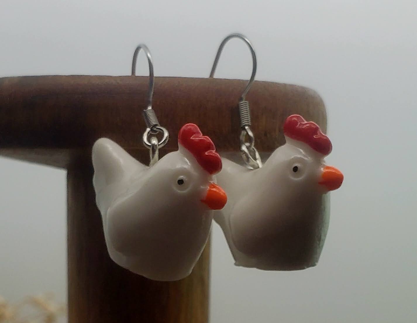 White chicken acrylic charm earrings on stainless steel hooks. Chicken has single red comb and orange beak. Earrings backs included.