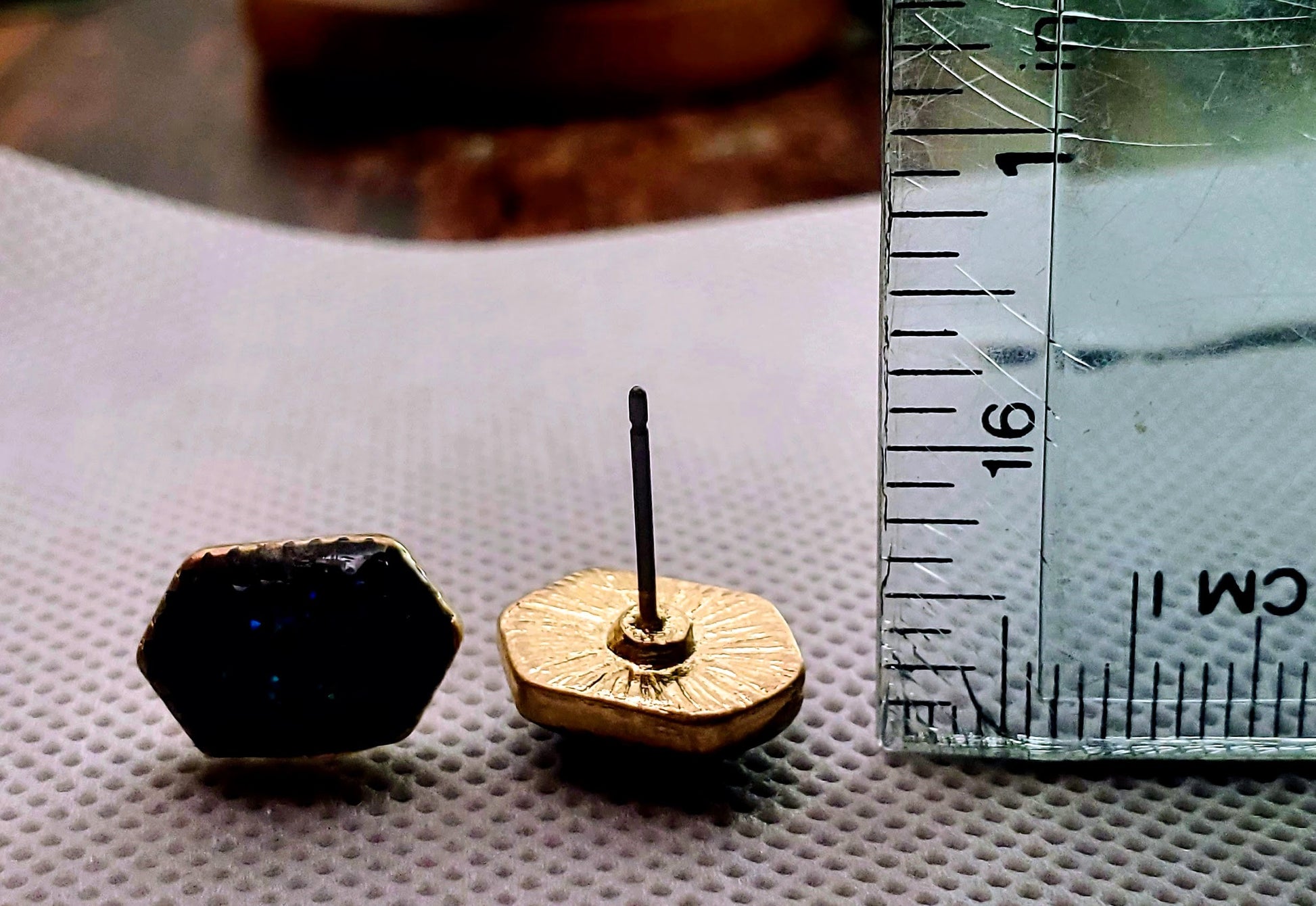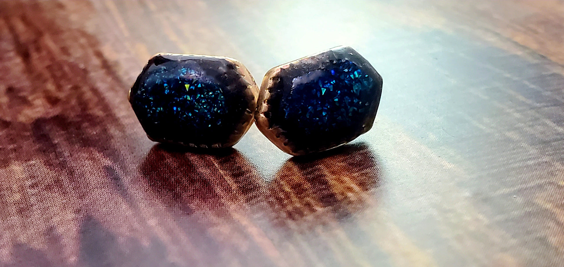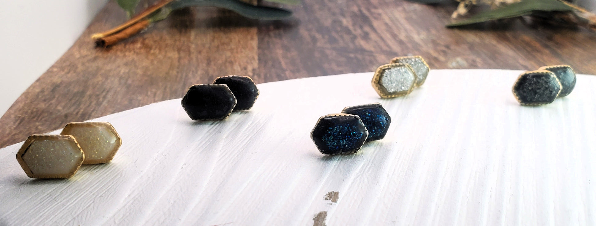 Update your look with these shiny stud earrings featuring a sparkling faux druzy hexagon stone. Topped with resin and set in gold plated and stainless steel studded bezel. Earring backs included.