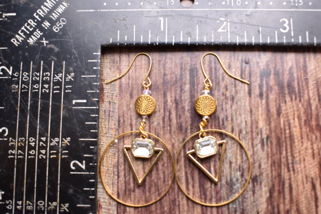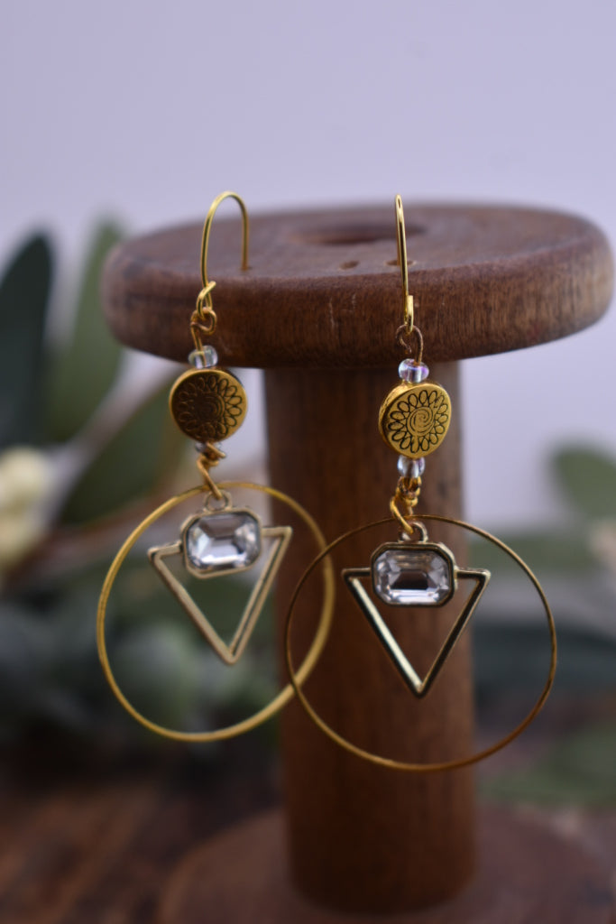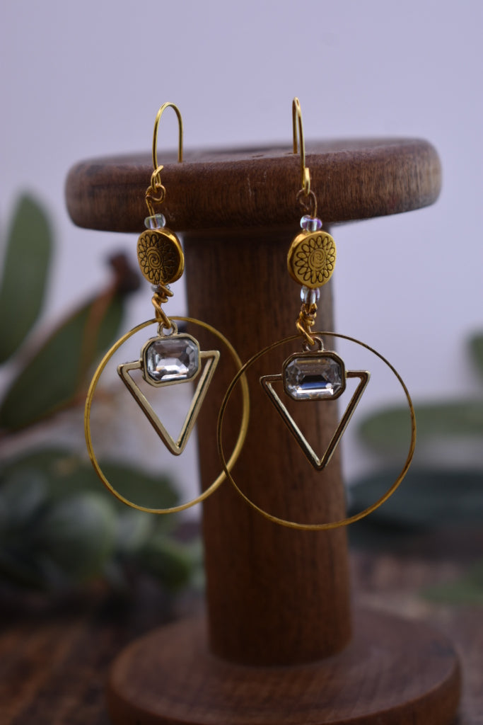 Gold plated hook earrings adorned with shiny bling and hoops. Versatile colors will make these your go-to accessory for any occasion. Earring backs included.